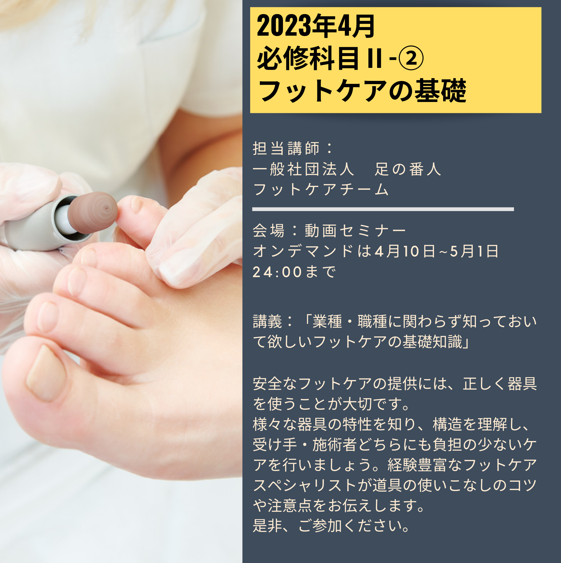 | 10 | 10 | 必修科目Ⅱ-② フットケアの基礎「業種・職種に関わらず知っておいて欲しいフットケアの基礎知識」 |